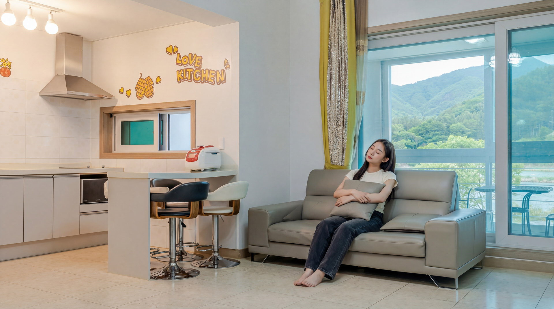 창문 너머로 흐르는 잔잔한 리버뷰를 바라보며, 부드러운 햇살과 함께 스며드는 풍경이 하루의 행복을 채워줍니다.